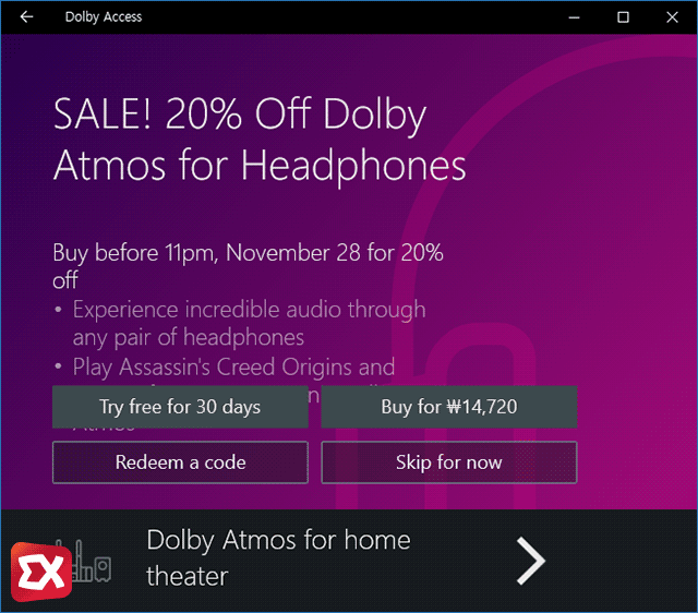 Dolby Access는 유료 프로그램이며 30일 동안 사용할 수 있는 체험판으로 제공되어 계속 사용하려면 구매를 해야하는 단점이 있습니다.