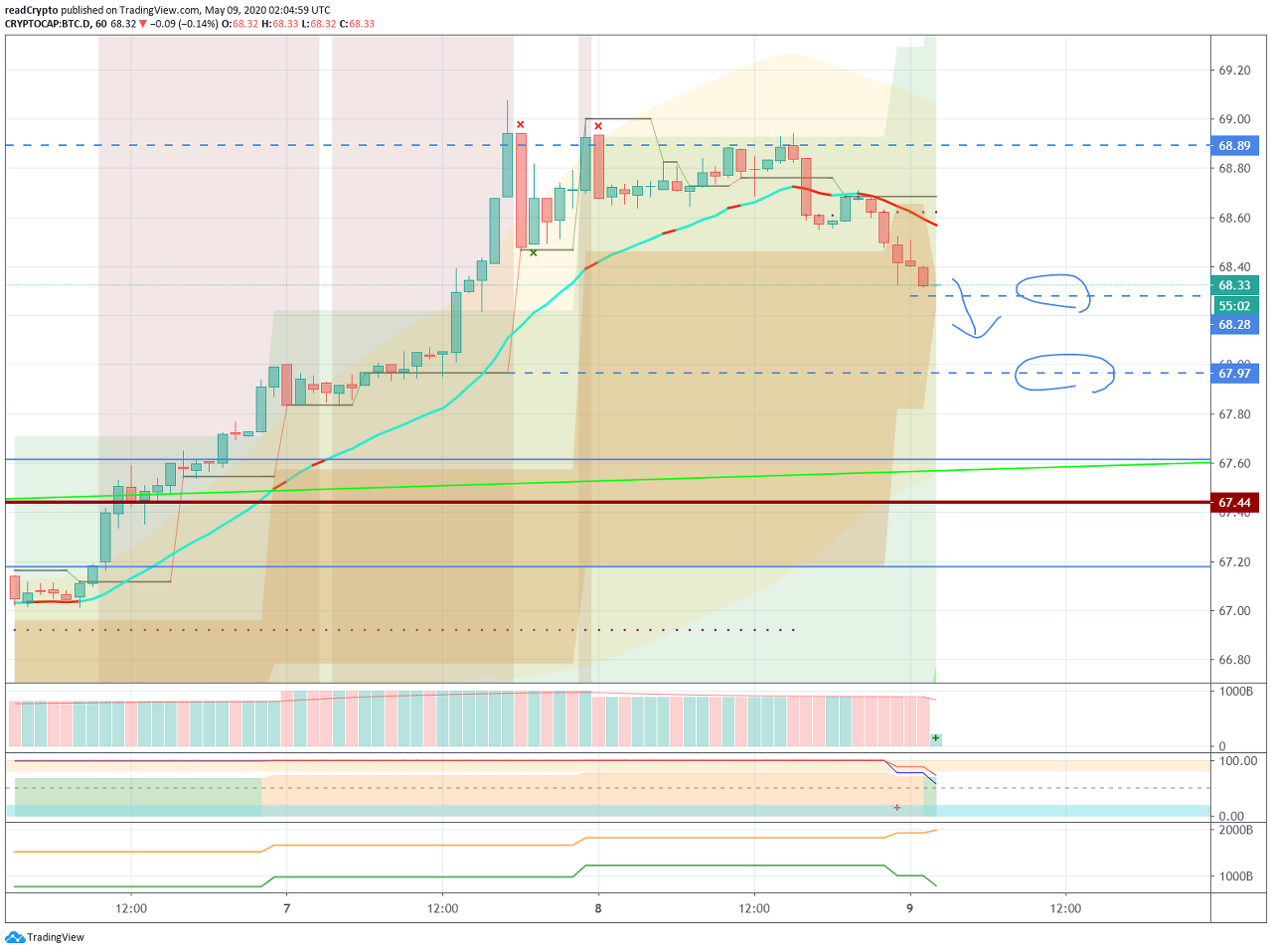 BTC 도미넌스가 68.28 지점 이하로 하락하여 67.97 지점을 터치할 수 있는지 확인이 필요합니다.