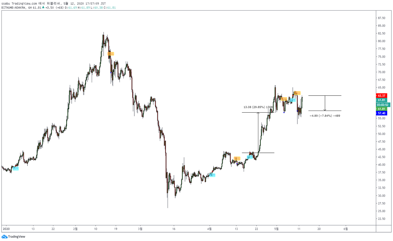 에이다 ( 빨간색 가로선이 BUY가 뜬 지점, 파란색 가로선이 SELL이 뜬 지점 )