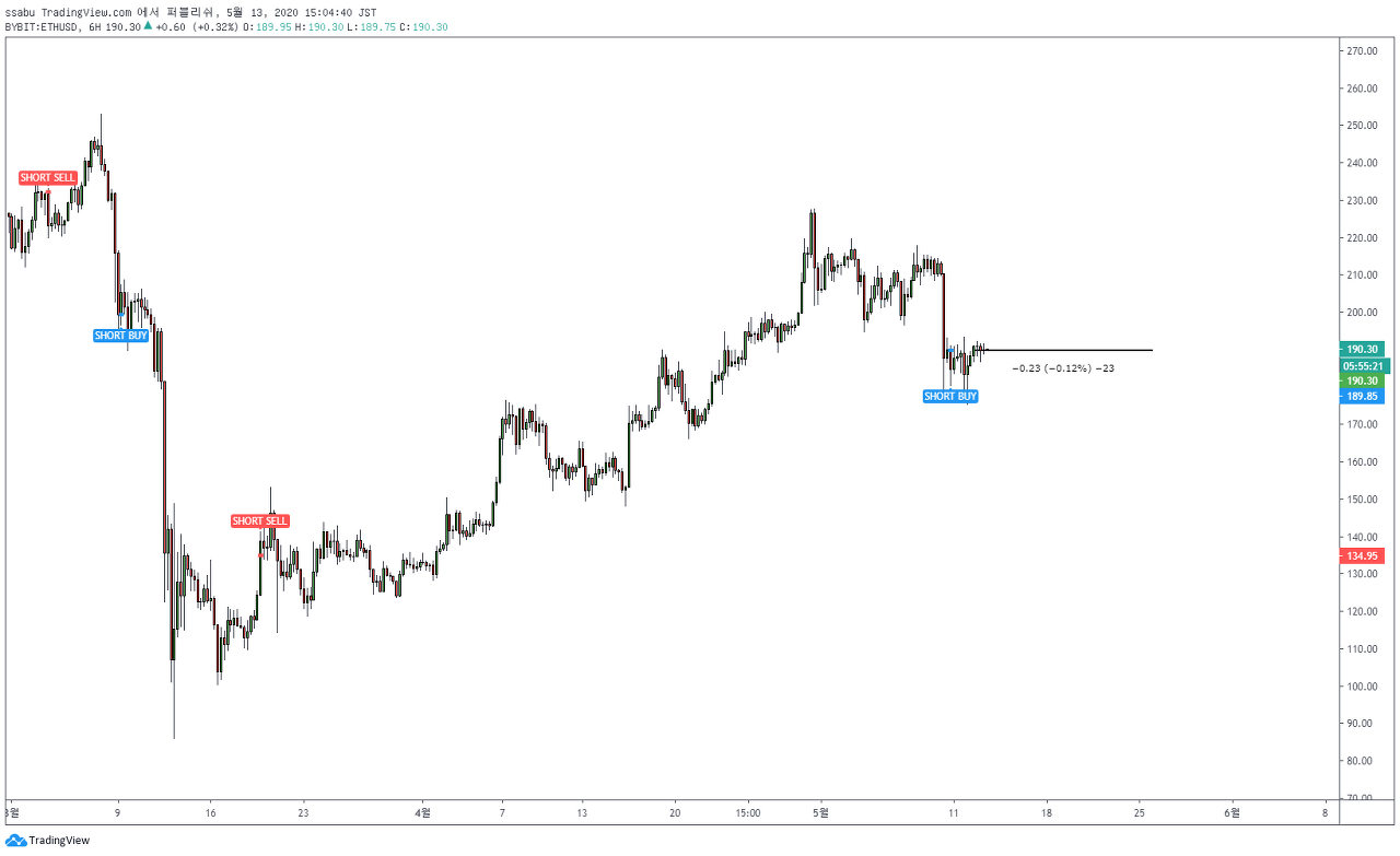 비트 ( 파란색 가로선이 SHORT BUY가 뜬 지점, 빨간색 가로선이 SHORT SELL이 뜬 지점 )
