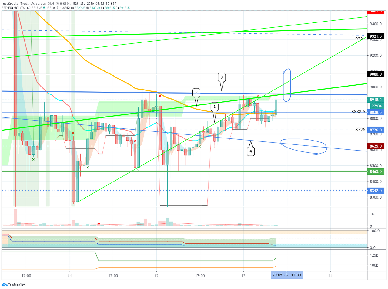 상승 추세선 (2)와 하락 추세선 (3) 이 교차하는 시간 이후에 BTC가 어느 추세선을 따라서 움직임이게 될지 확인이 필요합니다.
