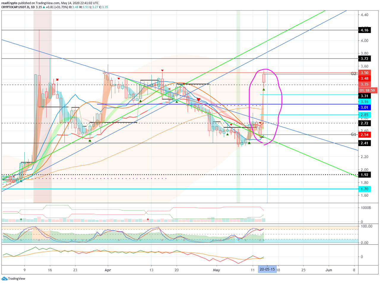 USDT 의 신규 발행으로 USDT 도미넌스가 상승하였다면, 그 USDT 는 코인을 매수하는데 사용될 가능성이 매우 높다고 생각합니다.