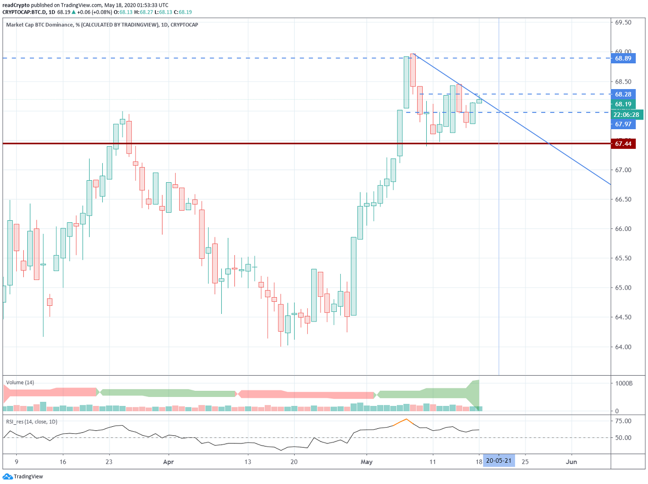 BTC 도미넌스가 5월 21일 이후에 67.97 지점 이하로 하락하여 있는지 확인이 필요합니다.