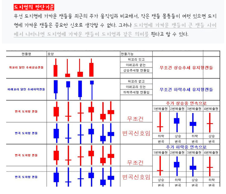 도지형캔들로 정확한 반전신호를 찾을 수 있는 경우 즉 상승장에서 쉽게 반전신호를 찾을 수 있을겁니다. 도지형은 상승장에서 장대 양봉이 출현한 후 도지형캔들이 나타낼때 대부분 천장에 있을 때 일겁니다. 상승추세에서 도지형캔들이 부정적으로도 분석이 됩니다. 왜냐하면 도지형은 망설임을 포함하고 있기 때문입니다. 왜냐하면 매수세력이 매수를 결정하지 못하고 망설이거나 불신하게 되면 주가의 상승이 지속될 수 없기 때문이죠.. 만약 주가가 장기간 동안 상승해 있거나 과매수 상태에서 도지형이 나타나게 되면 매수세를 지지하는 발판이 사라지고 있다는 것으로 파악하시면 됩니다.
