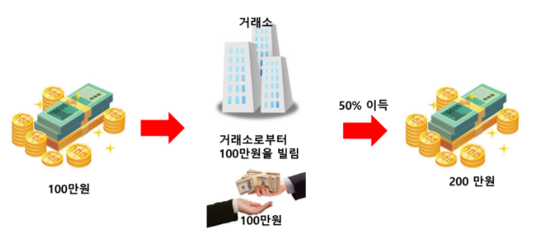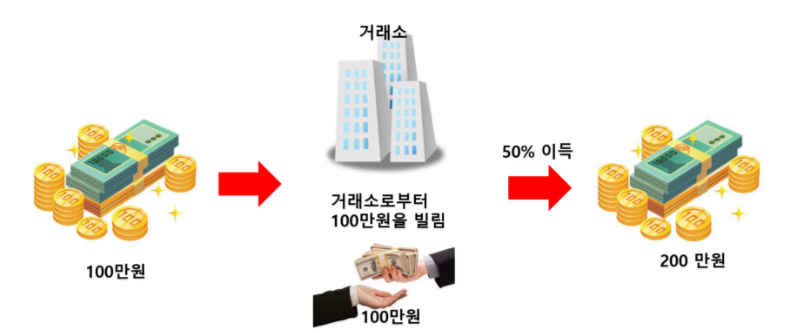 이 100만원을 거래소에 맡기고 그 100만원을 담보로 다시 100만원을 빌려서 총 200만원을 투자할 수 있으며 이는 마진배율 2배에 해당되겠죠? 이때 위와 동일하게 50% 이익이 나면 그 2배인 100만원 수익이 나고 수익이 난 후 빌린돈 100만원을 거래소에 돌려주면 50% 수익만으로 2배의 수익인 100만원의 수익을 챙길 수 있습니다.