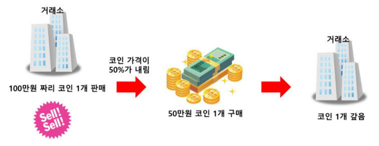 예를 들면 1코인에 100만원하는 코인을 거래소에서 빌려서 시중에 100만원에 판매합니다.