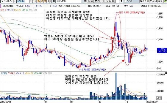 흑삼병은 상승의 추세가 종료되는 저가 근방에서 시작하고 길이가 긴 음봉을 갖고 직전 일봉들에 대해서 종가 기준 하락폭이 계속 확대가 되서 나타나는 34개에 일봉으로 형성이 됩니다 분명 흑삼의 출현은 하락추세로에 전환을 의미하나 주식을 매도의 타이밍도 아주 중요합니다 흑삼이 출현을 했다해 무조건 3일째 음선에서 추격매도를 하는 기법들은 좋지 않습니다 흑삼이 출현을 하면 대부분 단기급락에 따른 반발매수세가 유입이 됩니다 즉 반등이 발생을 하게 되는데 흑삼 출현시에 추격매도하게 되면 손실을 줄일수가 있는 기회를 놓치게 됩니다 흑삼이 출현을 하게 되면 최대한 반등을 이용해 매도를 해야 합니다 또 데이트레이더는 변동성이 심해지는 구간인 만큼 단기매수급소로 판단을 해볼수도 있습니다 흑삼의 출현을 위에서 배워본 하락삼중창과 비슷한 원리를 갖고 있으며 흑삼병의 출현시에 개인의 투매가 강하게 발생을 하면 V형 상승이 나타날수도 있습니다 바닥권에서 매집중인 종목중 상한가 잘나오는 세력매집종목은 따로 있습니다 세력연구소 검색후 가보시면 상한가 잘나온 차트자료가 있는데요 보시면 크게 도움이 되실겁니다 이러한 경우 매도를 하고서 큰 후회를 하게 될 수도 있습니다 절대 흑삼 마지막날에 투매에 가담을 해선 안됩니다 그 다음날 반등을 이용해서 매도를 해야하고 반등이 없으면 그때 확인을 하고 매도를 해도 늦지 않다고 볼 수 있습니다