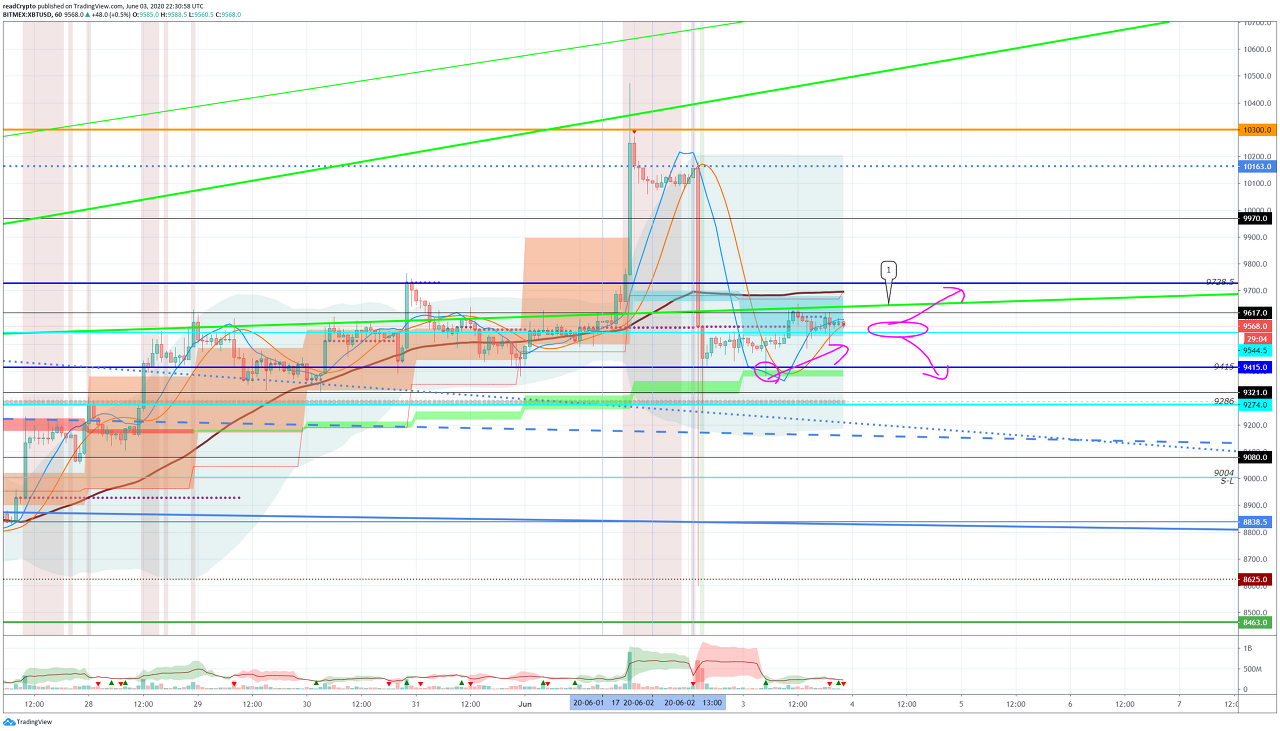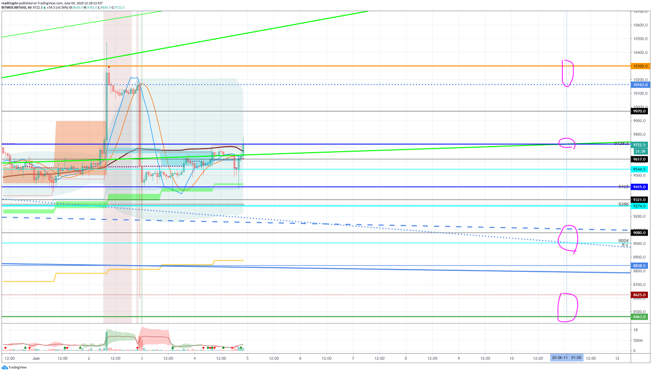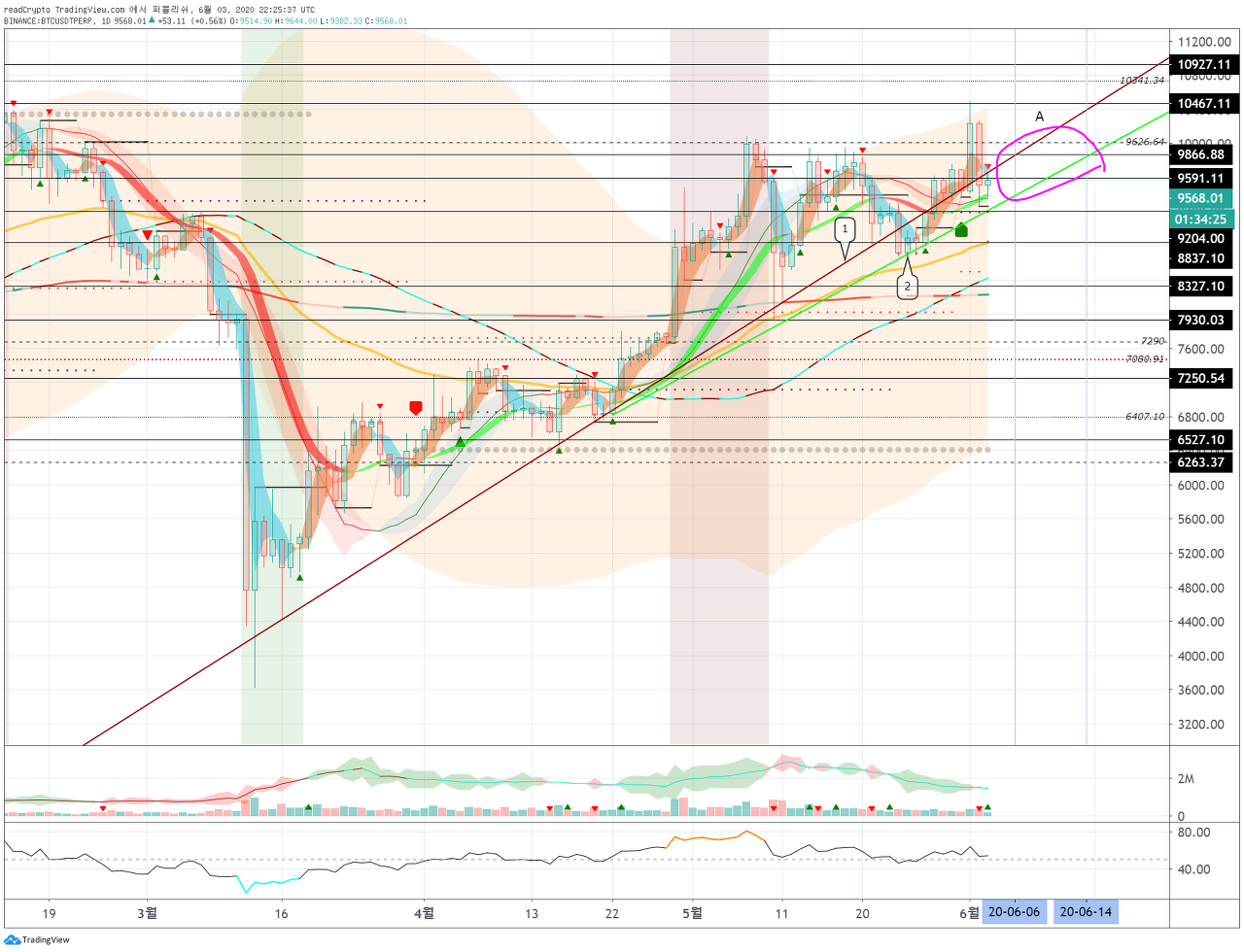 6월 4일은 고점매물대 구간(9415~9728.5) 의 대락적인 중간 지점인 9544.5 지점에서 지지를 받고 상승 추세선 (1) 이상 상승할 수 있는지를 확인해야 합니다.