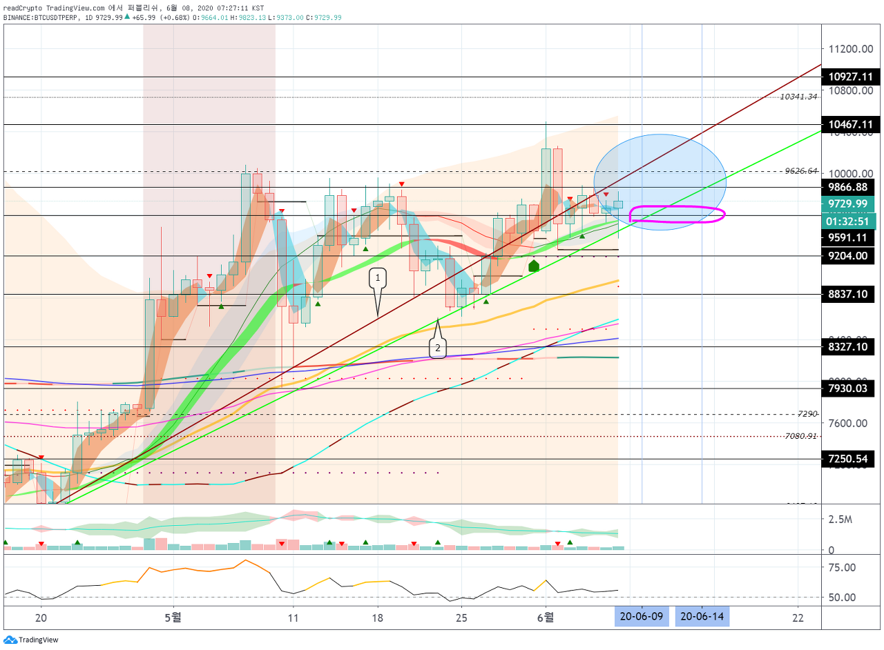 9728.5 지점을 터치하였다면, 9728.5 지점 이상에서 지지를 받는 것이 좋습니다.