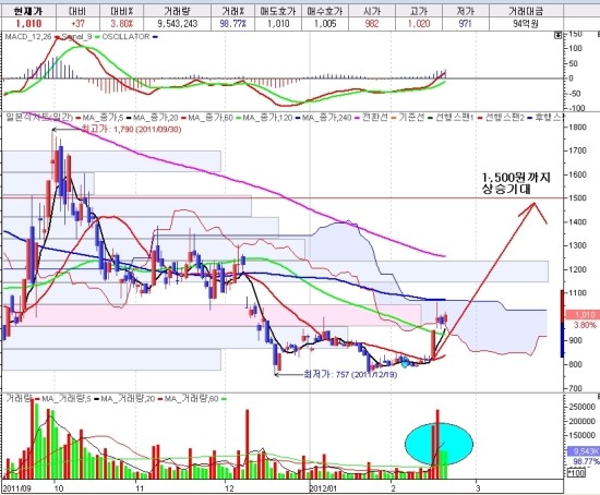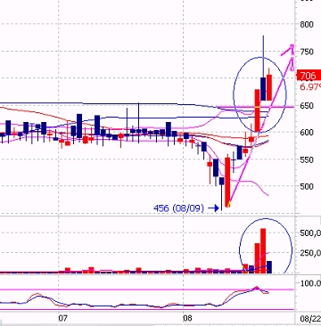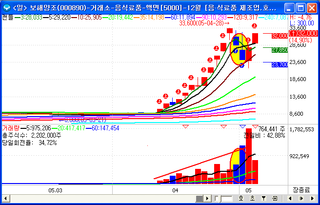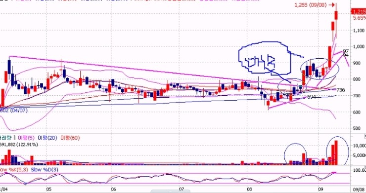 거래량 증가가 무엇을 의미하는가? 위 그림은 단기간 저점대비 400%이상 한 종목의 흐름이다. 평상시 분출하지 않는 거래량이 분출하면서 주가는 급등을 하고 있다. 일반인들은 거래량 지표를 크게 신경쓰지 않거나 모르고 지나가는 점이 있는데 반드시 거래량 지표 설정은 주가 상승하락 연동으로 설정해야 한다는 것이다. 바닥권에서 매집중인 종목중 상한가 잘나오는 세력매집종목은 따로 있습니다 세력연구소 검색후 가보시면 상한가 잘나온 차트자료가 있는데요 보시면 크게 도움이 되실겁니다 위 그림 중 주가 하락시 거래량의 상태도 음봉이 나오는 것을 볼 수 가 있고 주가 상승시에는 거래량도 양봉이 만들어지는 것을 확인할 수 있다. 매수의 물량은 양봉으로 체크하고 매도의 물량은 음봉으로 체크해서 주도 세력들의 물량이 매수중인가 매도중인가를 판단하고 매수나 매도의 시점을 찾을 수 있는 아주 중요한 내용이다.