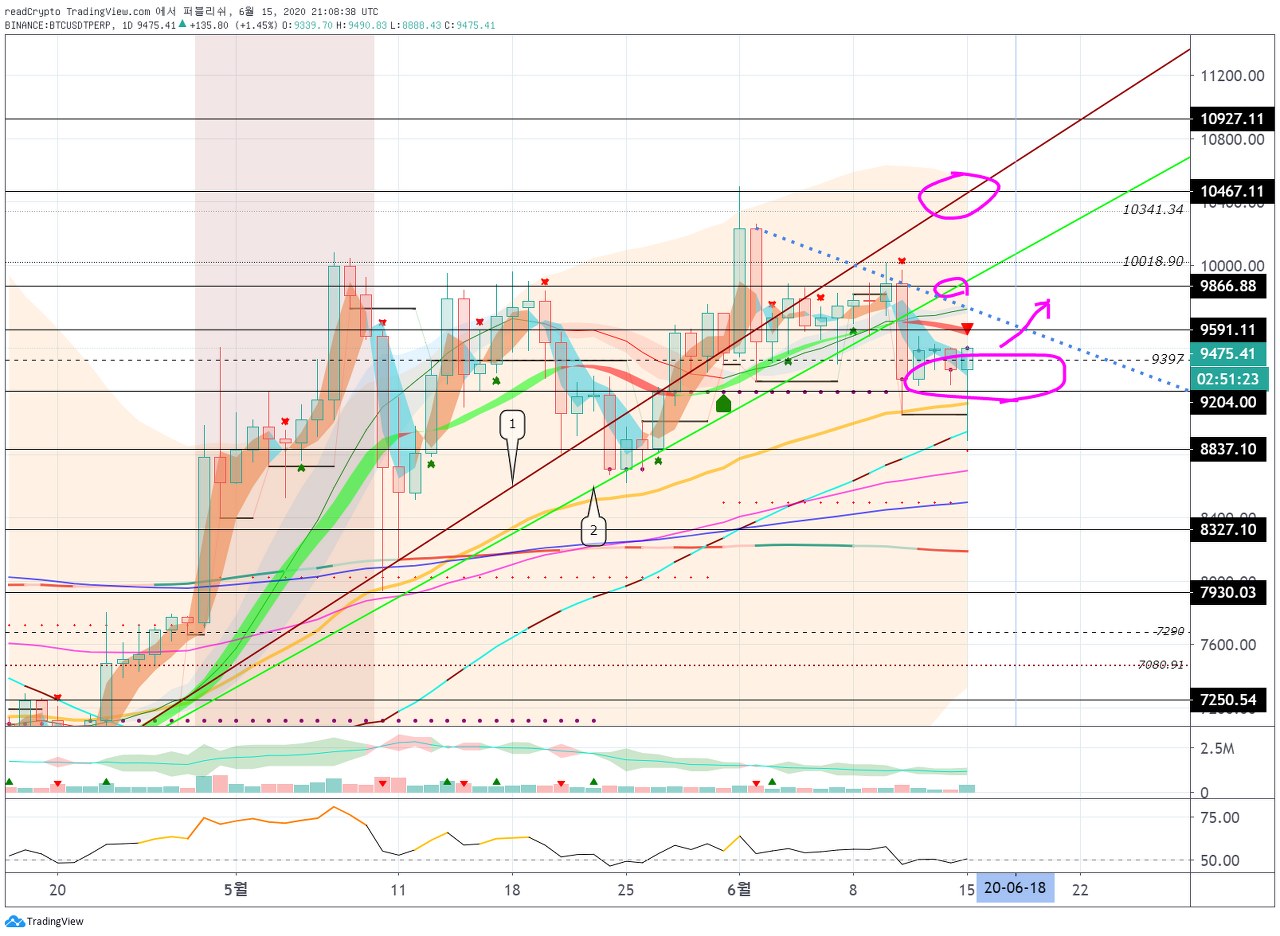 6월 18일경(6월 17일~19일)에 9591.11 지점 이상 상승하여 단기 하락 추세선 이상 상승할 수 있을지 확인해 봐야 합니다.