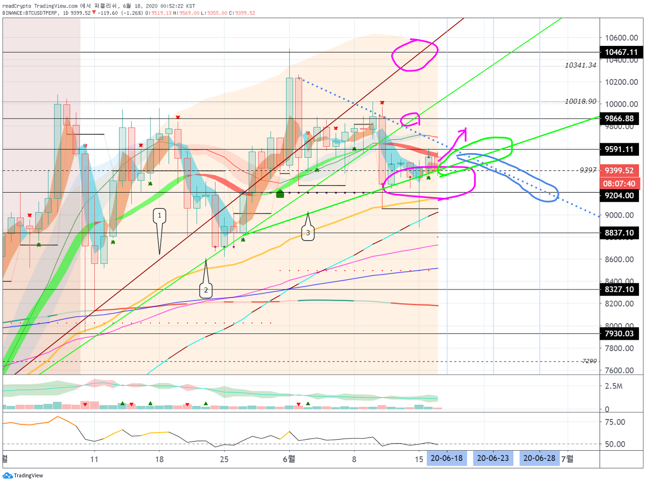 예상했던대로 상승 추세선 (3)을 따라 상승을 하여 6월 18일경 이후에 9591.11 지점 이상으로 상승할 수 있을지 확인이 필요합니다.