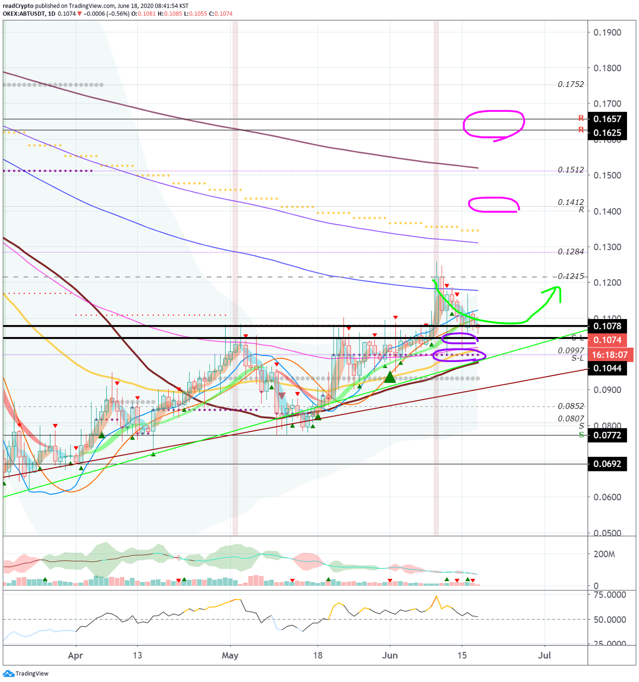 'V'자가 아닌 'U"자를 그리는 모습이 나오기 위해서 필히 0.1044~0.1078 구간에서 지지를 받는 모습이 몇 일 동안 이어져야 합니다.
