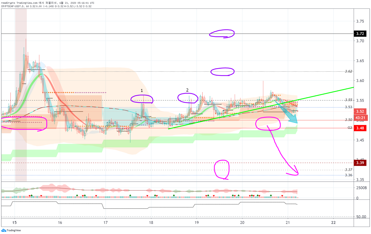 이대로 갭 구간인 3.48~3.50 구간 이하로 하락할 수 있을지 확인이 필요합니다.