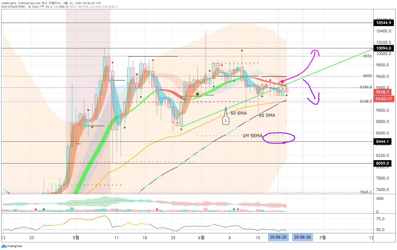6월 21일 9415 지점 이상 상승하여 지지를 받을 수 있을지 확인이 필요합니다.