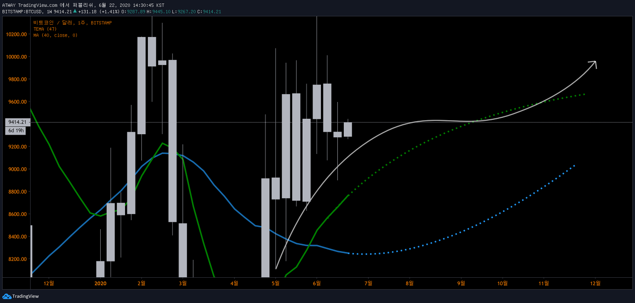 2019년 하락장에서 40주선은 이평선의 특성상 9천달러 위에서의 흐름에는 도움이 되지 않았으며 대신 반등이 나올 위치를 암시하였습니다.