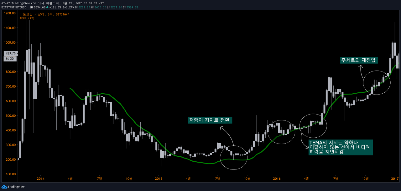 TEMA 47은 Triple EMA 47주선을 의미합니다. 2014-2015 하락장을 보시면 TEMA의 저항이 지지로 전환되면서 마무리되었고, 해당 이평선이 지지가 되면서 본격적인 상승장이 왔음을 확인하실 수 있습니다. 이 구간을 MA로는 하락추세의 저항과 그 하락장이 마무리된 지점, 그리고 상승장의 초입부를 동시에 지지해주는 값을 찾을 수 없습니다.