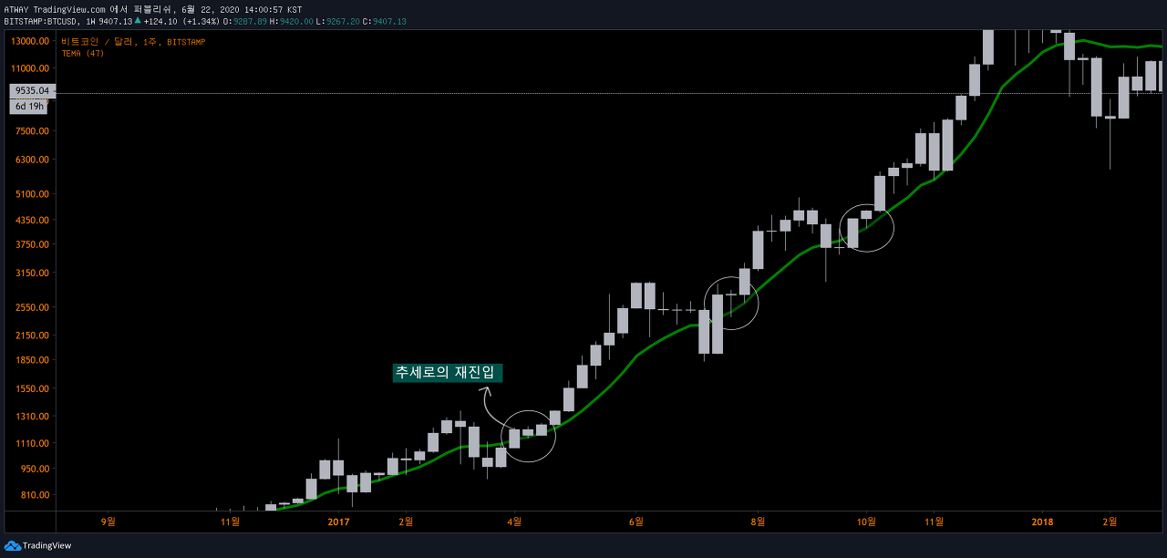 TEMA 47은 Triple EMA 47주선을 의미합니다. 2014-2015 하락장을 보시면 TEMA의 저항이 지지로 전환되면서 마무리되었고, 해당 이평선이 지지가 되면서 본격적인 상승장이 왔음을 확인하실 수 있습니다. 이 구간을 MA로는 하락추세의 저항과 그 하락장이 마무리된 지점, 그리고 상승장의 초입부를 동시에 지지해주는 값을 찾을 수 없습니다.