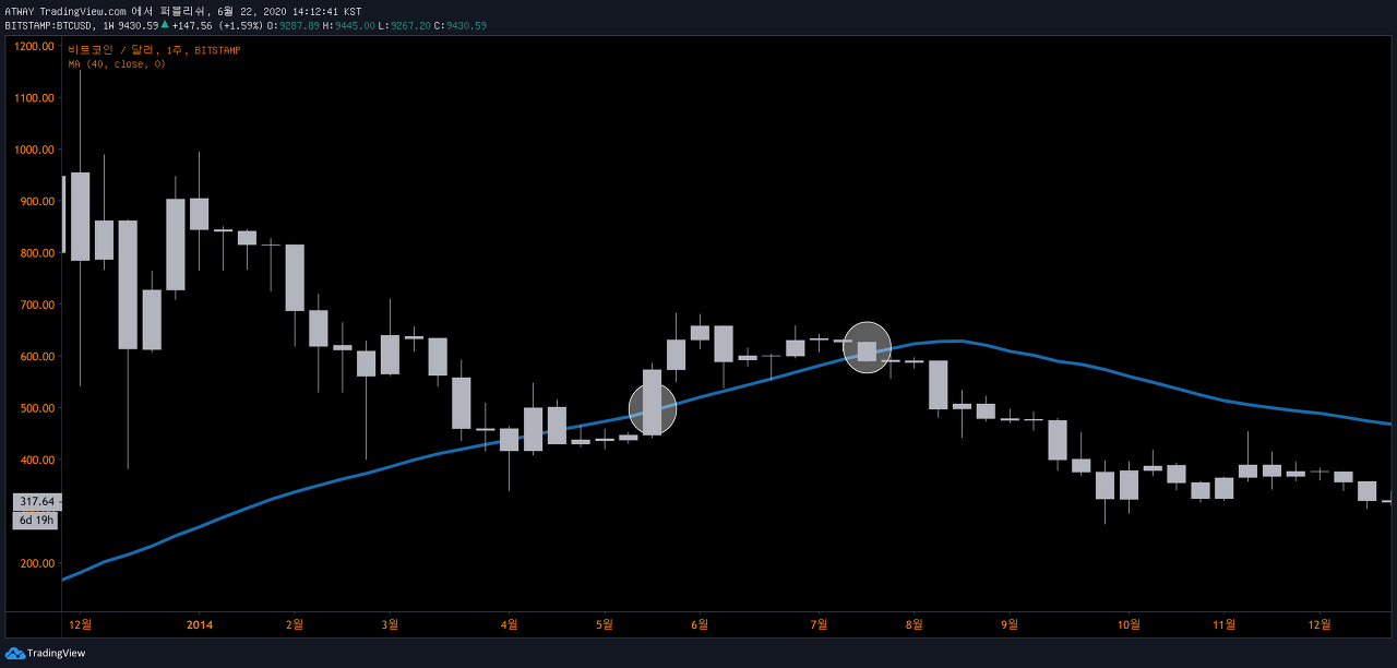 14년도에 40주선 돌파와 함께 압축된 반등이 나오고 40주선을 깨며 하락장으로 다시 전환됩니다.