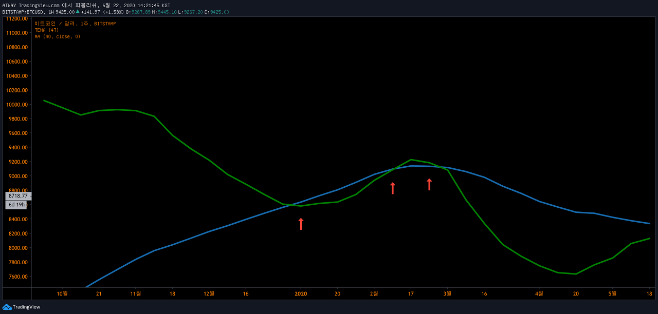 2019년 하락장에서 40주선은 이평선의 특성상 9천달러 위에서의 흐름에는 도움이 되지 않았으며 대신 반등이 나올 위치를 암시하였습니다.