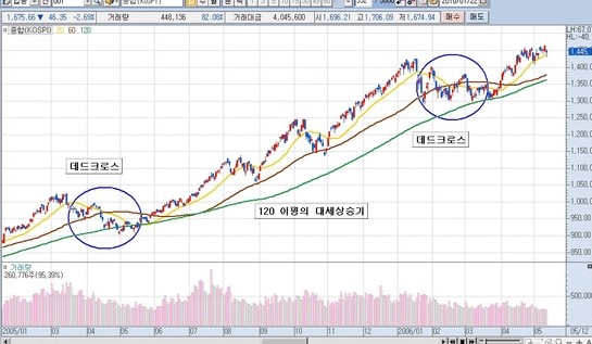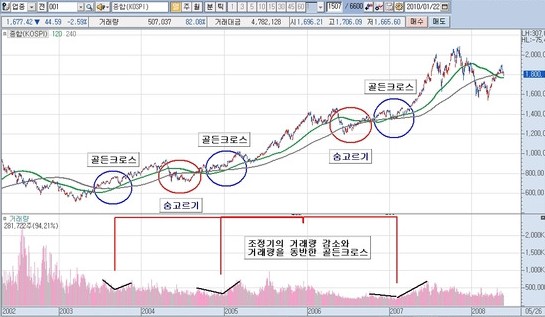 이동평균선매매는 단기 이평선이 장기 이평선을 밑에서 위로 치고 올라가며 만나는 때를 말하는 겁니다 일반적으로 이 타이밍을 강력 매수의 신호로써 해석을 합니다 이땐 거래량에 변화에 주목을 해야합니다 거래량의 증가는 강력 매수의 신호라고 할 수 있기때문입니다 약세장서 나타나는 골든크로스는 종종 반등을 하지 못하고 오히려 하락을 합니다 이것은 단기간에 주가 상승을 의식한 경계매물, 매매차익의 매물이 출회가 되기때문입니다 그래서 약세장서 나타나는 골든크로스는 오히려 단기 매도의 시점이 될수가 있습니다 진짜 골든크로스는 상승을 하는 장기 이평선을 단기이평선이 밑에서 위쪽으로 상향돌파를 해야합니다