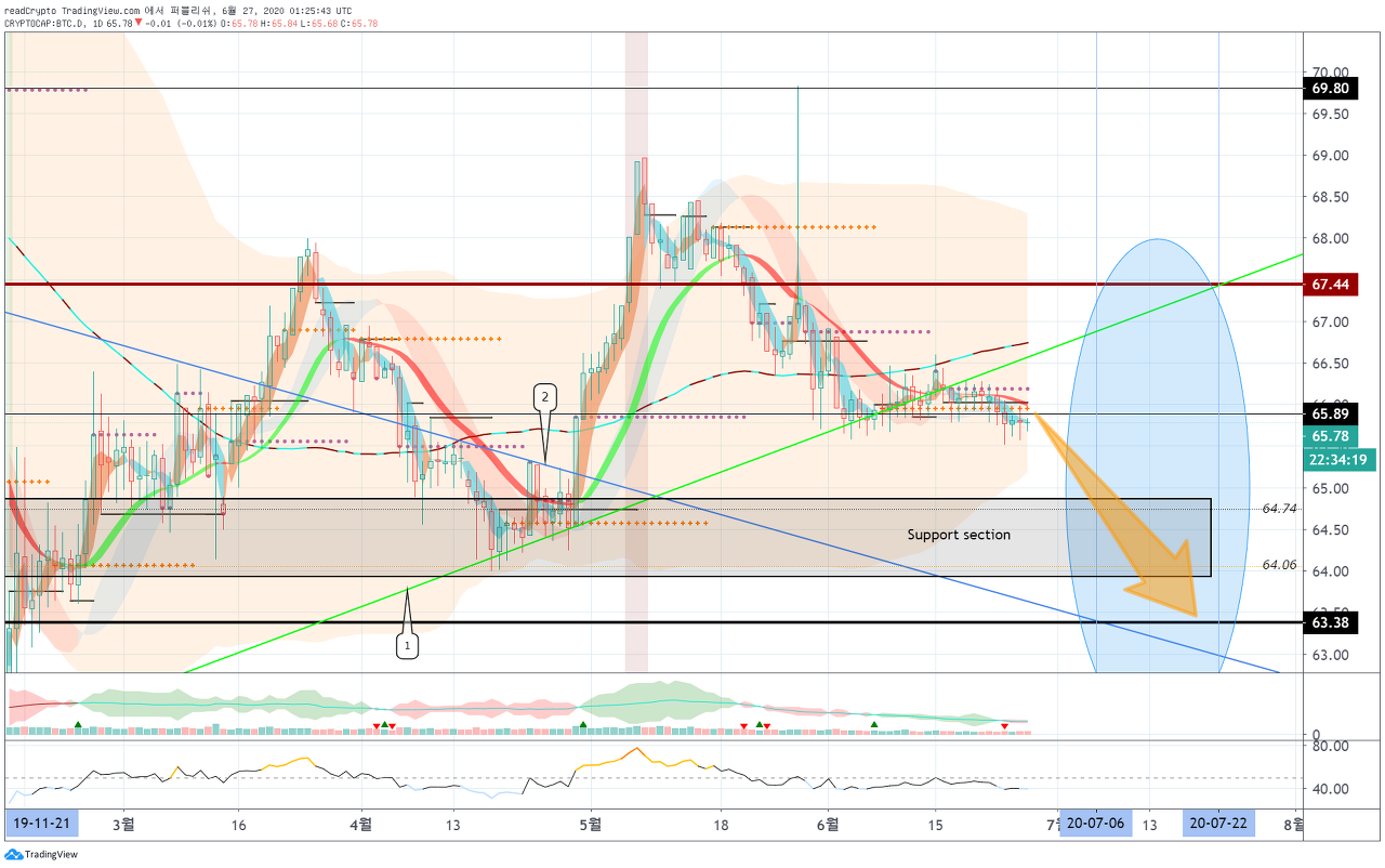 이 때, BTC 도미넌스가 65.89 지점에서 저항을 받는지도 확인해야 합니다.