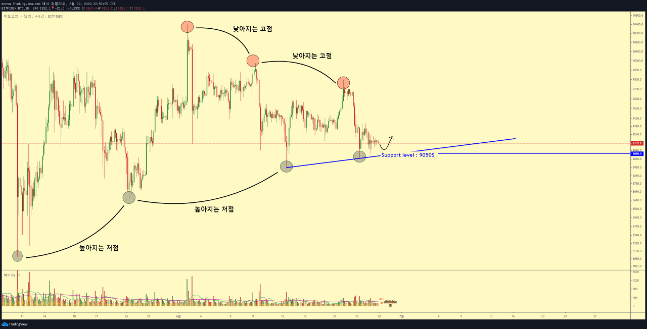 1차적인 지지레벨은, 9000~9100$ 부근이 될 것이며, 해당 가격대에서는 스윙거래가 아닌, 단기적인 데이트레이딩으로써 매수전략을 고려하게 됩니다