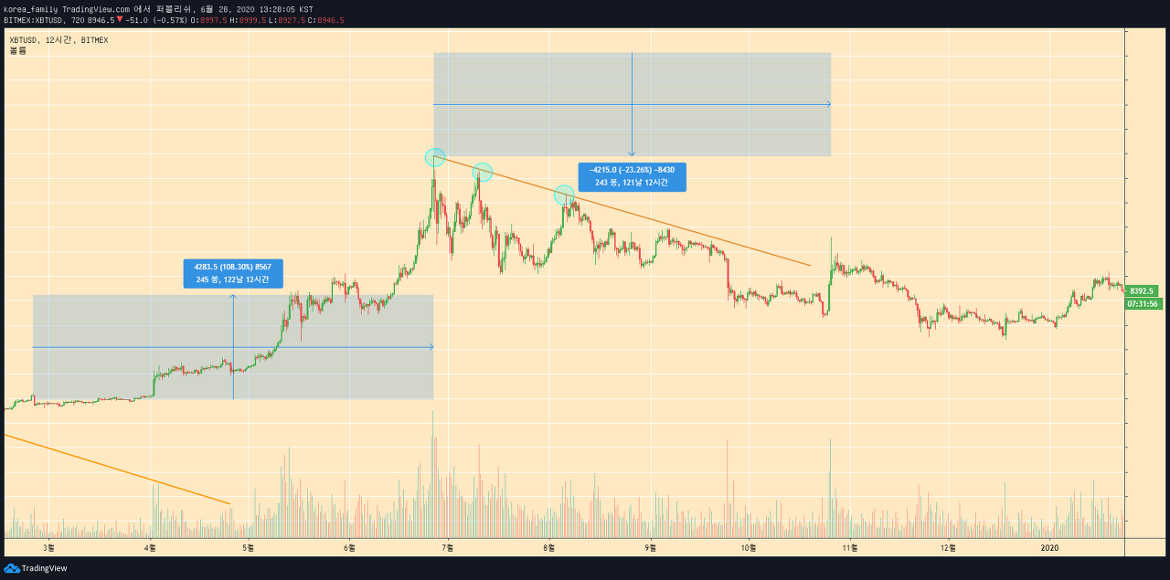 19년의장의 상승 시작점과 끝점 그리고 하락의끝점을 알리는 부근까지의 기간은 거의 동일합니다.