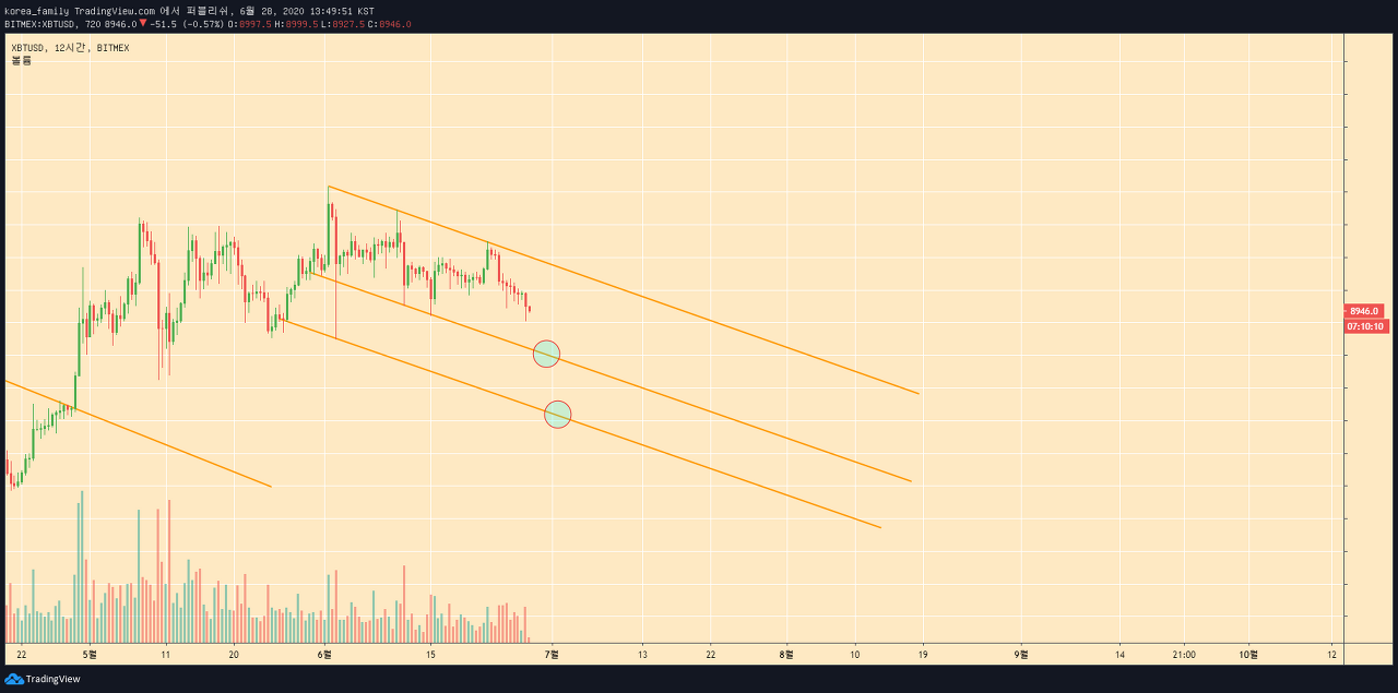 지금 보는 차트는 우하향 차트패턴으로 현재는 큰상승에서 조정이될지 하락장으로 되돌아갈지는