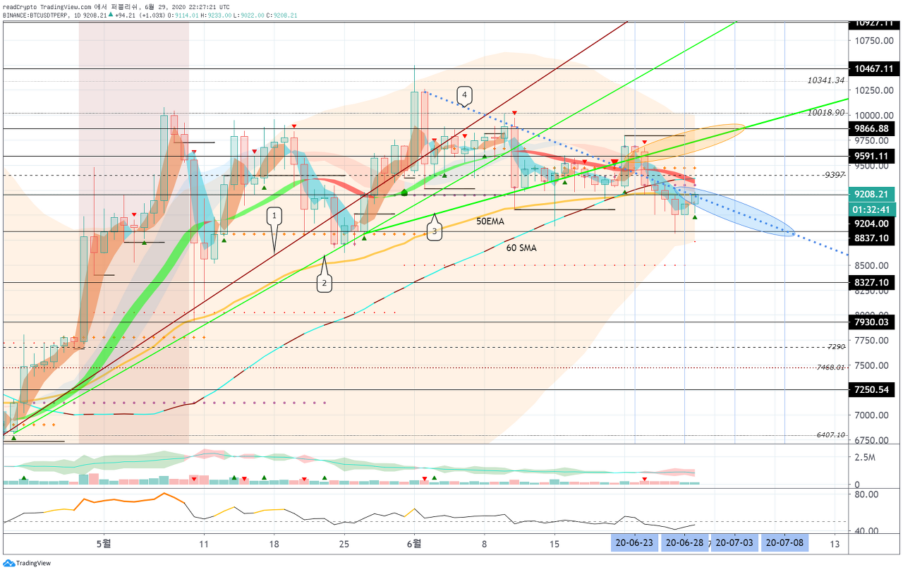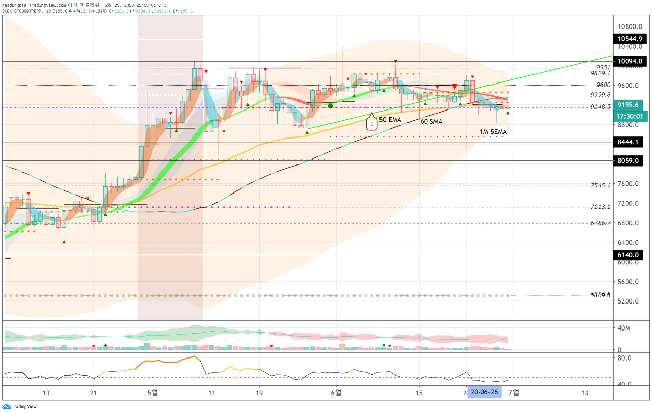 9274 지점 이상 상승하지 못한다면, 3K EMA 이하를 터치할 가능성이 크다고 생각합니다.