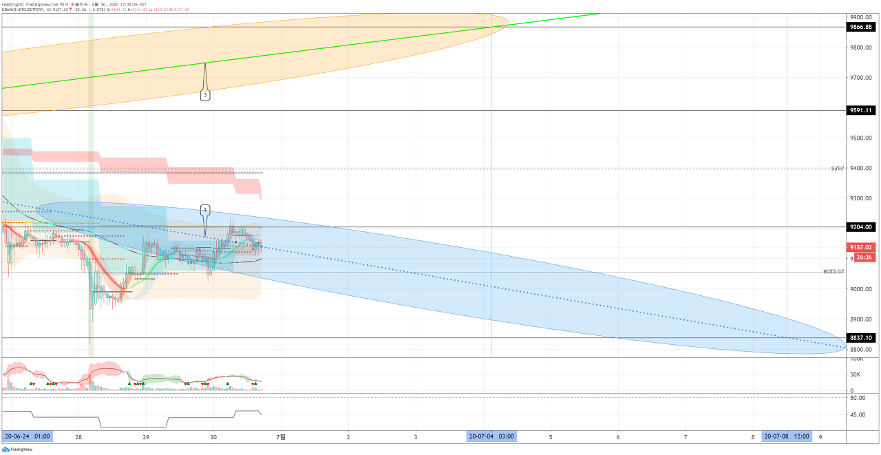 하락 추세선 (4)와 9204 지점 이상에서 지지를 받을 수 있을지 확인이 필요합니다.