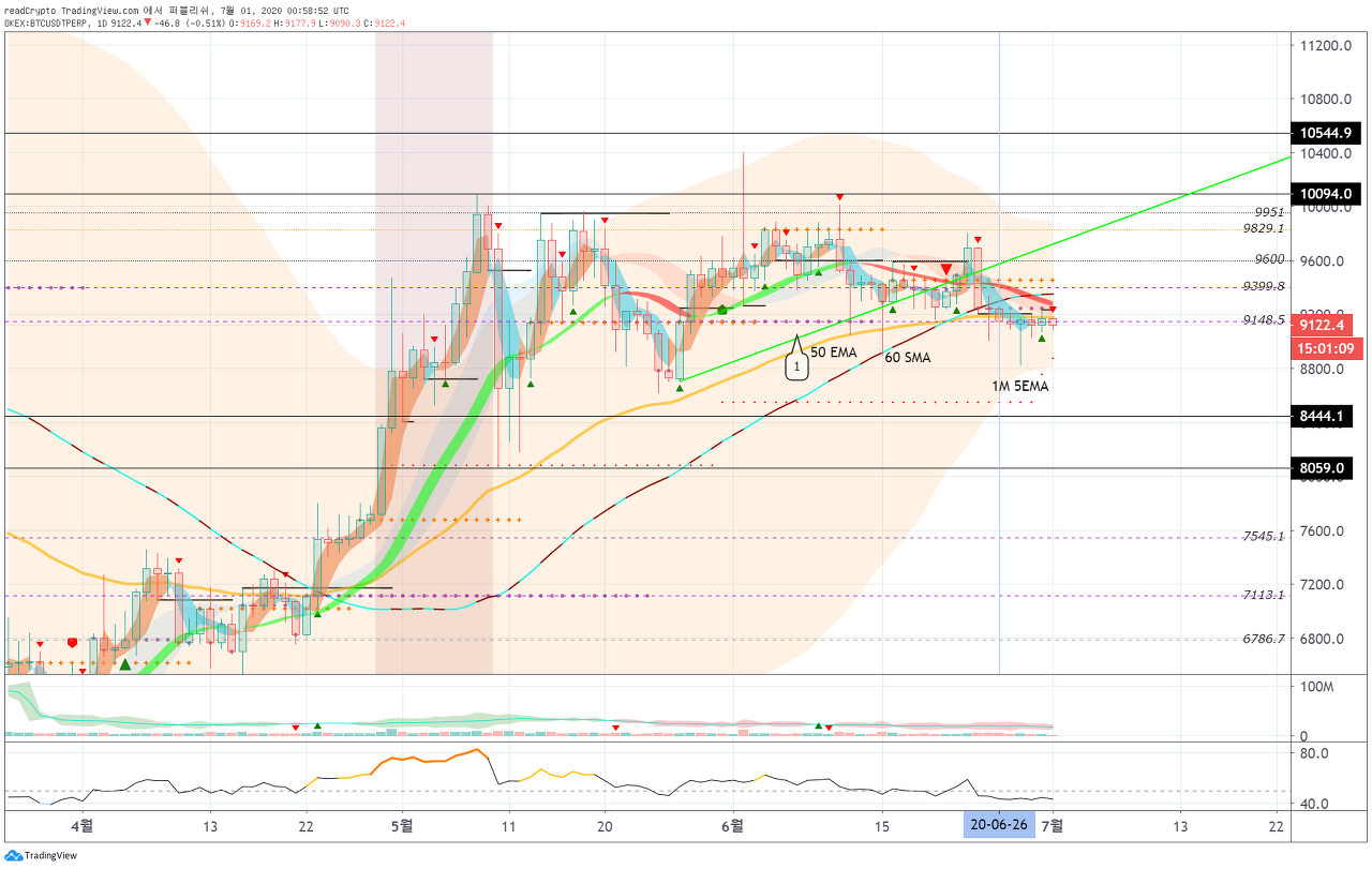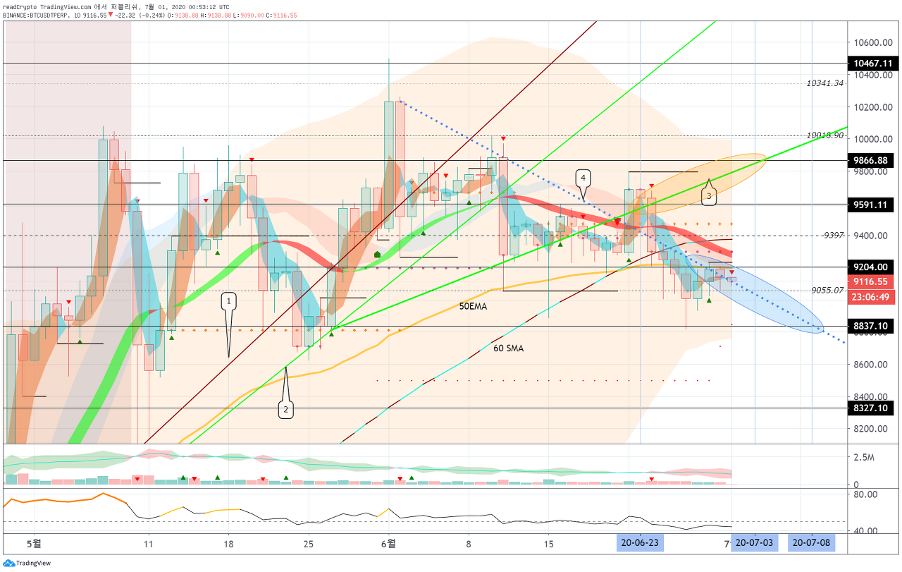 하락 추세선 (4)에서 지지를 받으면서 7월 3일경(7월 2일~4일)에 9204 지점 이상 상승할 수 있는지 확인이 필요합니다.