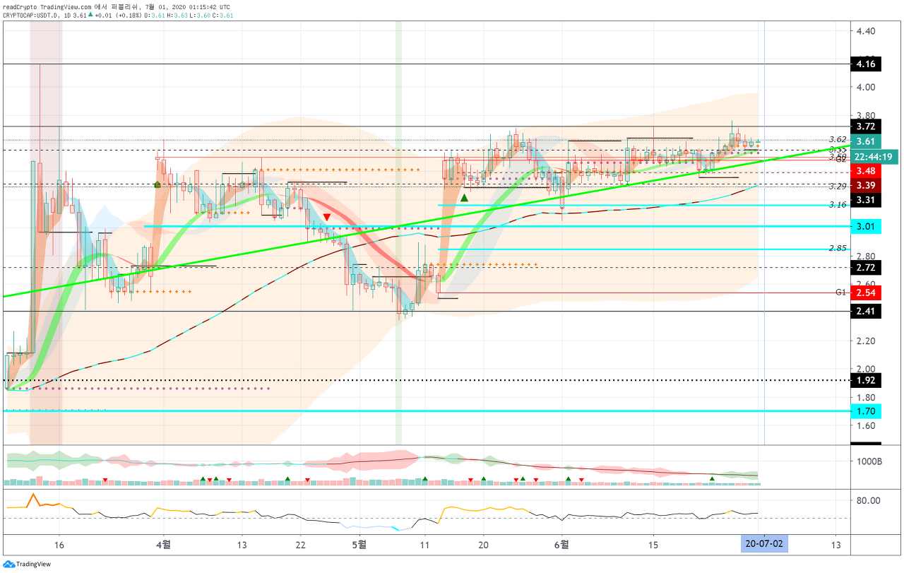7월 2일경(7월 1일~3일)에 3.48 지점 이하나 상승 추세선 (1) 이하로 하락할 수 있는지 확인이 필요합니다.