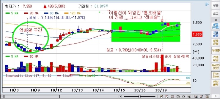 허나 이런것을 세밀히 관찰하고 안하고에서 수익은 천차만별인 것입니다.우리는 정보에 뒤쳐져 있기에 챠트를 관찰하고 매매를 할 수 밖에 없습니다. 그럼 차트를 관찰하고 파악하는데 자신의 모든 것을 집중하는 것이 당연합니다 다른 것이 더 중요하다면 그것에 더 집중하는 것이 옳습니다 정배열이 된다는 것은 이제 시세를 분출할 준비를 마쳤다라고 생각하시면 됩니다 주가는 파동을 그리면서 등락을 하는데 자신은 그 파동의 어느 자리에서 매매를 하고 싶으신가요?이것은 자신이 정하고 그 자리에서 기다리면 됩니다 즉 자신의 매매스타일이 되는 것이죠 장중에 이 종목, 저종목 번갈아 쫓아다니다간 뇌동매매에 빠지기 쉽상입니다 시장에서 살아남기를 원한다면 단순하게 만드시기 바랍니다 단순명료함에 답이 있다고 저는 생각합니다.