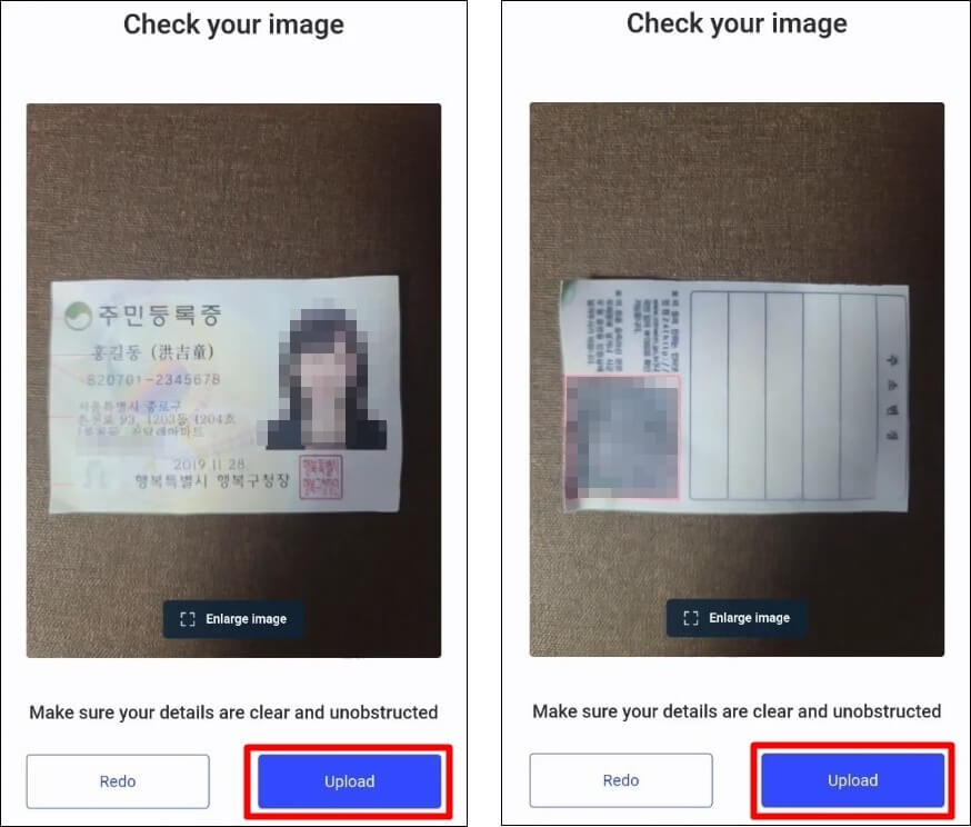 프레임에 맞게 신분증 앞면, 뒷면을 촬영하고 각각 'Upload(사진 제출)' 버튼을 눌러줍니다. 여권의 경우는 뒷면 촬영을 하지 않아도 됩니다.
