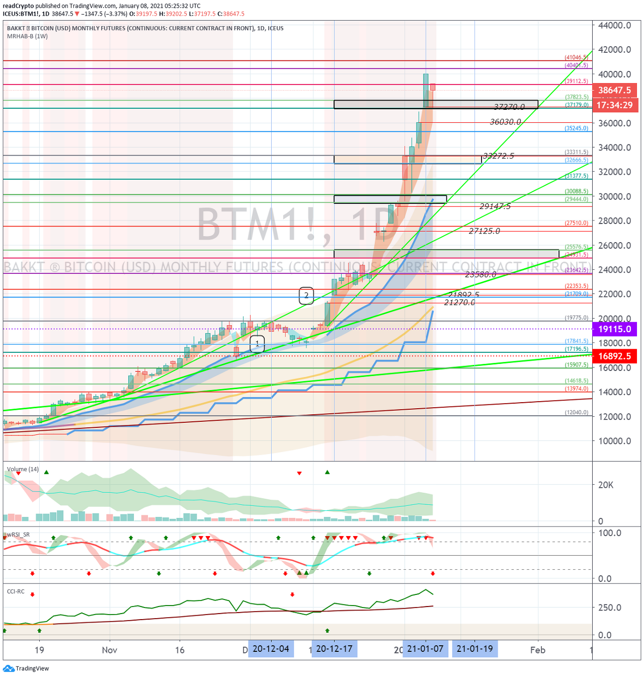 1월 14일경-21일경 사이에 상승 추세선을 차례대로 터치할 수 있는 지켜봐야 합니다.