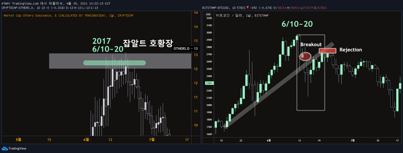 17년도 6월에도 비트코인이 하락추세로 반전된 시점부터 잡알트의 도미넌스가 최고치로 올라섰습니다.