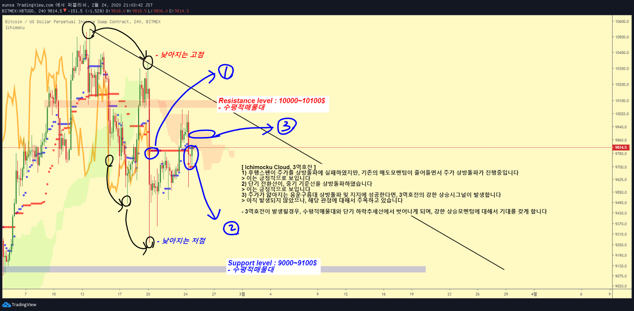 비트코인의 단기적인 방향은, 1) 수평적매물대 -Resistance level: 10000 ~ 10100$ 저항돌파 2) 수평적매물대 -Support level: 9000 ~ 9100$ 지지방어 이 두 구간의 움직임이 중요한 관전포인트로 보여집니다