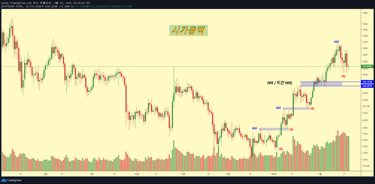 (1) 전체 암호화폐 시가총액의 흐름은, 알트코인보다 비트코인의 자금이탈이 다소 거셌습니다 (2) 알트코인은 이더리움의 견고한 가격방어아래, 큰 자금이탈은 안보입니다 (3) 거시적 관점에서, Dow-Theory(다우이론)의 상승파동 조건을 여전히 만족하고 있습니다 (4) 직전 Higher High(HH) 부근의 지지 및 이탈여부에 따라, 대응을 해나가십시오