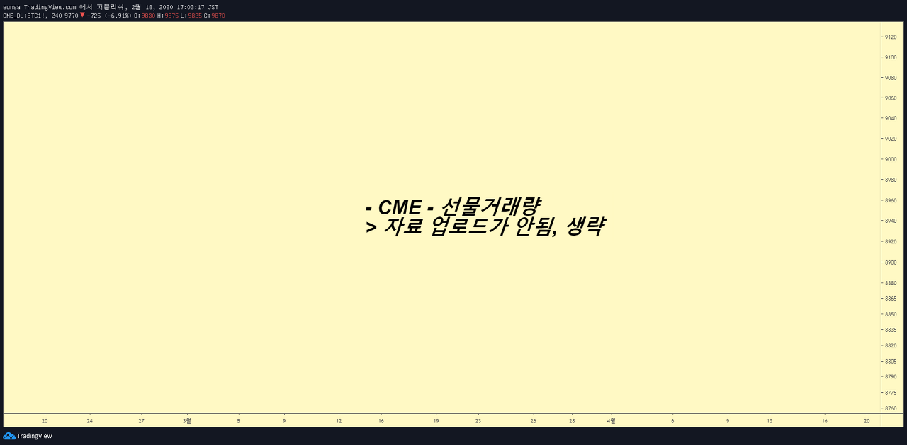 (1) CME-선물시장에서, 10500$ 고점부근에서 다소 큰 거래량이 터졌습니다 (2) 고점에서 거래량이 터지며, 음봉이 진행되는 것은 불길한 징후를 뜻합니다 (3) 금일 개장과 동시에, CME-Gap : 9980 ~ 10475$형성이 되었으며. 해당 CME-Gap은 중요한 저항레벨 및 추세에 대한 기준점이 될 것으로 보입니다 (4) CME-02월물의 만기가 다음주이오며, CME-03월물 시가가 8200~8300$으로 이미 진행되고 있습니다 CME-03월물의 시가 8200~8300$를 하방 이탈하지 않는한, 중장기적인 상승모멘텀 및 상승추세는 지속되리라 보여집니다