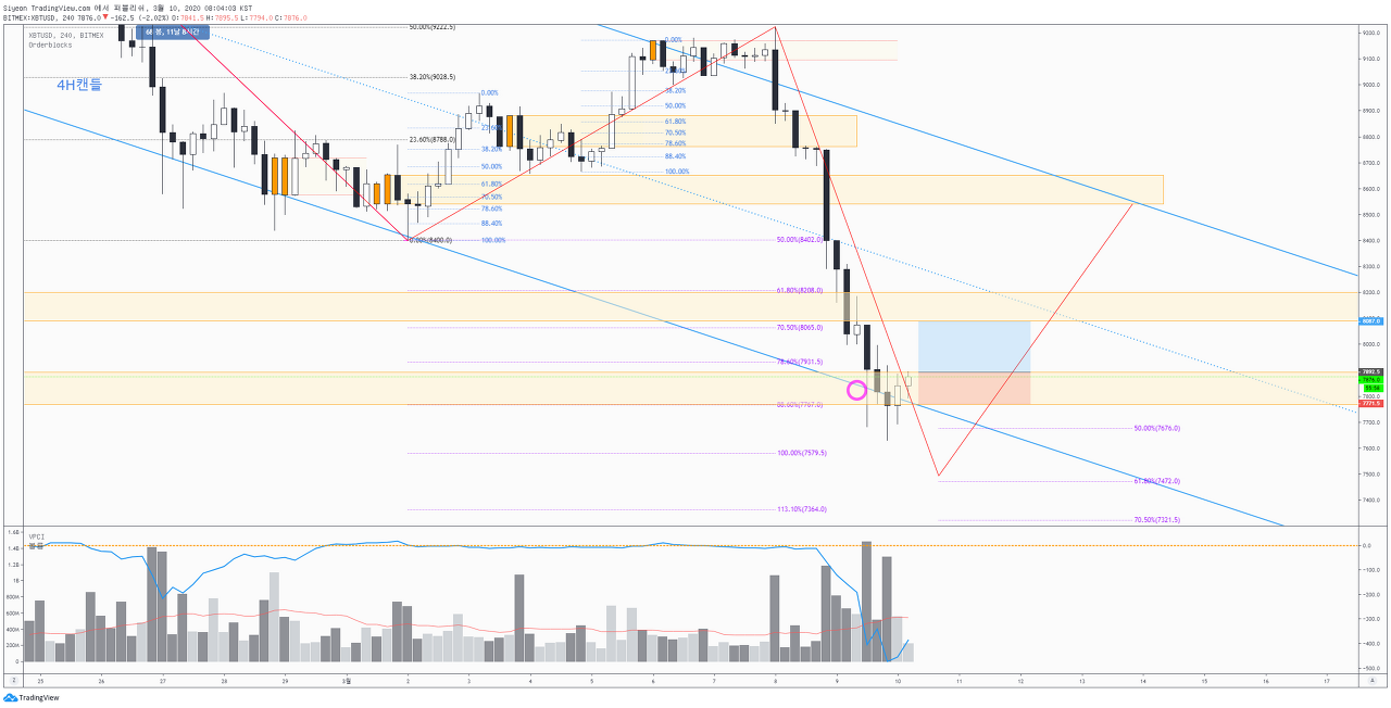 2018년 고점에서 하락파동이 이어지는 과정에서 a로 표기한 오더블럭의 지지테스트에 성공한뒤 되돌림이 나오는 양상입니다.