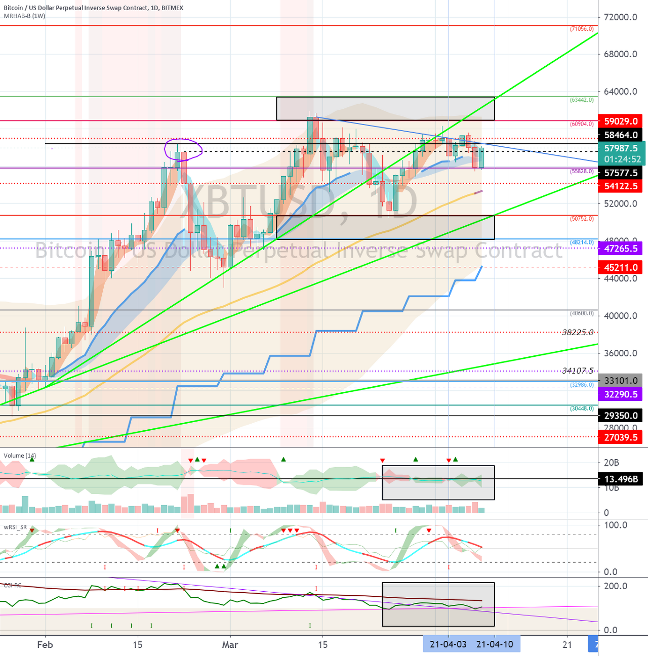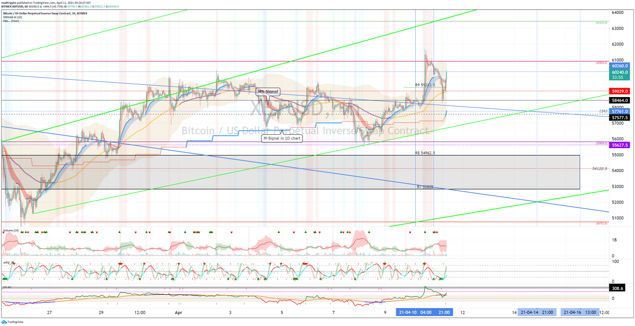 BTC 가격이 XBTUSD 차트(60904.0 지점), BTCUSDT 차트(60886.07 지점) 이상에서 지지를 받기 위해서는 거래량이 증가되어야 한다고 생가합니다.