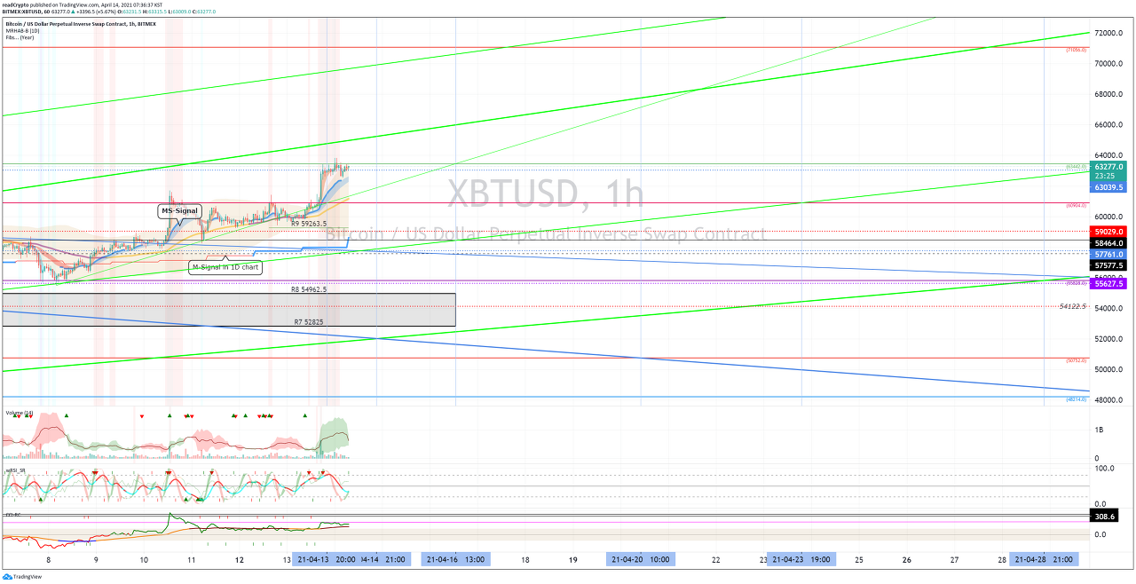 그러므로, XBTUSD 차트(63442.0 지점), BTCUSDT 차트(63423.46 지점) 을 상향 돌파하여 상승하게 된다면, XBTUSD 차트(71056.0 지점), BTCUSDT 차트(71035.63 지점) 을 터치할 것으로 기대됩니다.