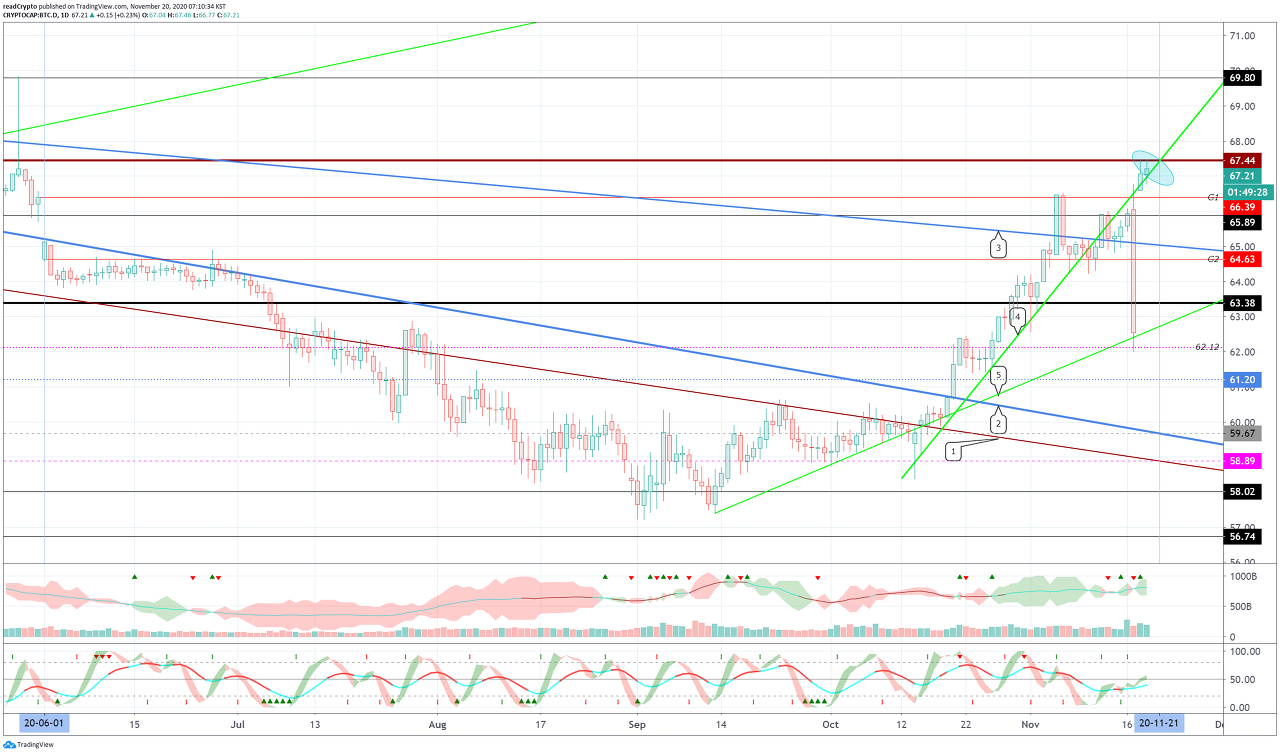 61.20-62.12 구간으로 하락할 수 있는지 지켜봐야 합니다.