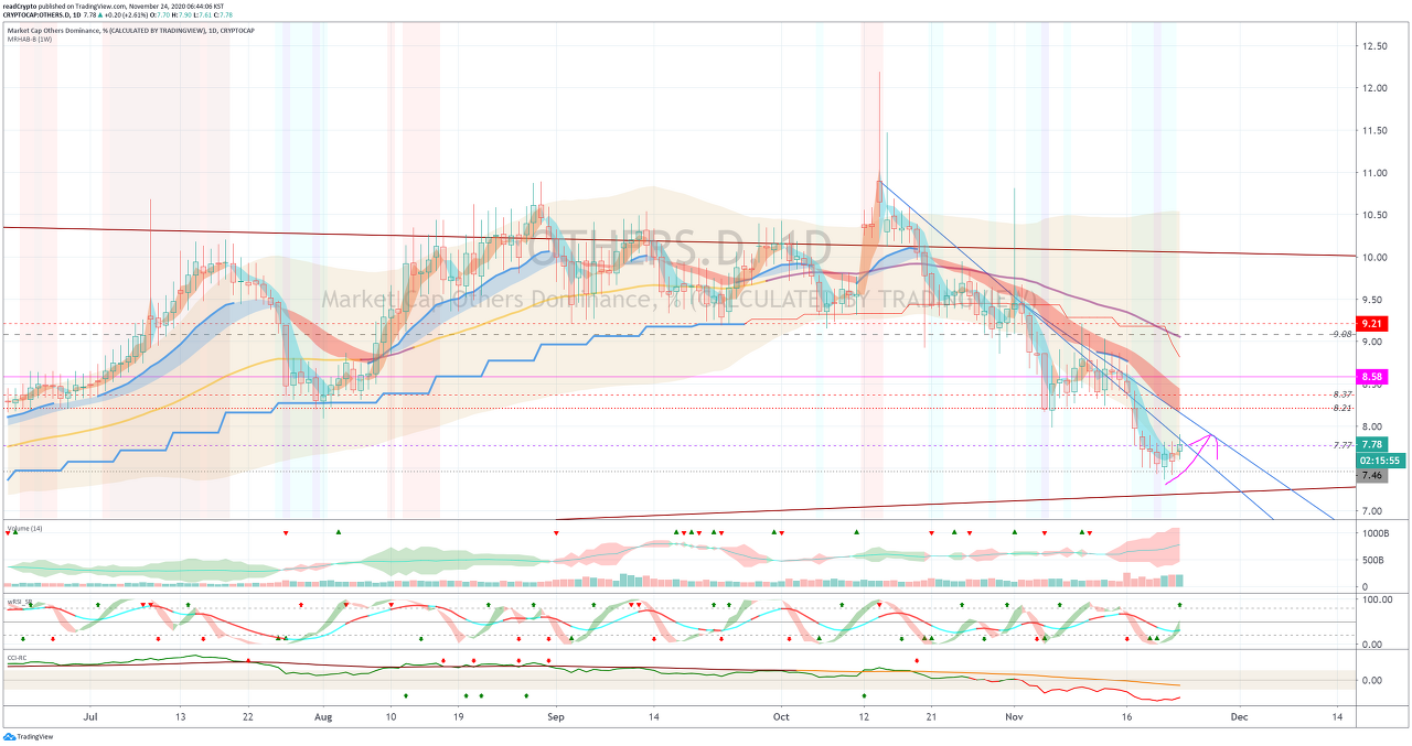 BTC와 메이저코인들을 제외한 나머지 알트코인에 대한 도미넌스가 상승하려고 시도 중 입니다.