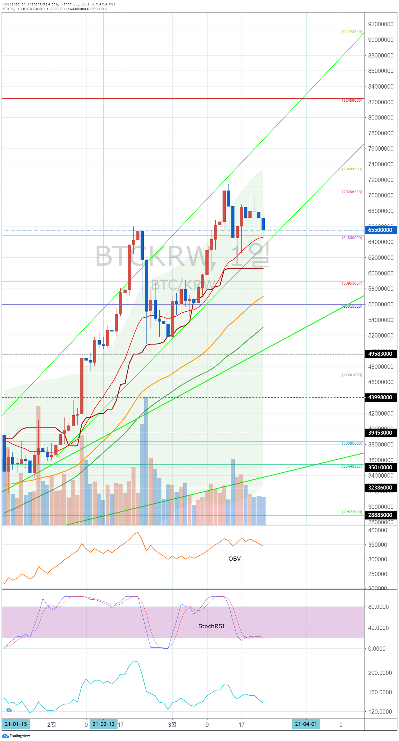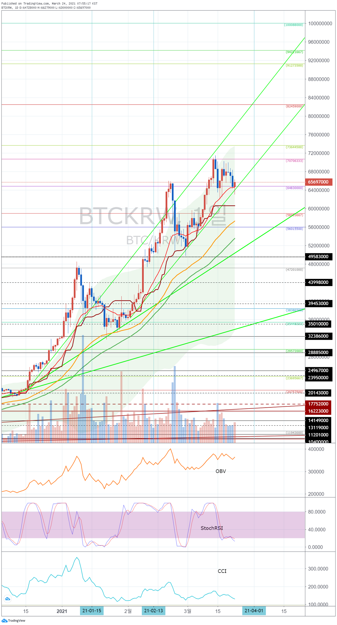 65800000 지점에서 지지를 받고 상승 추세를 이어갈 수 있는지 지켜봐야 합니다.