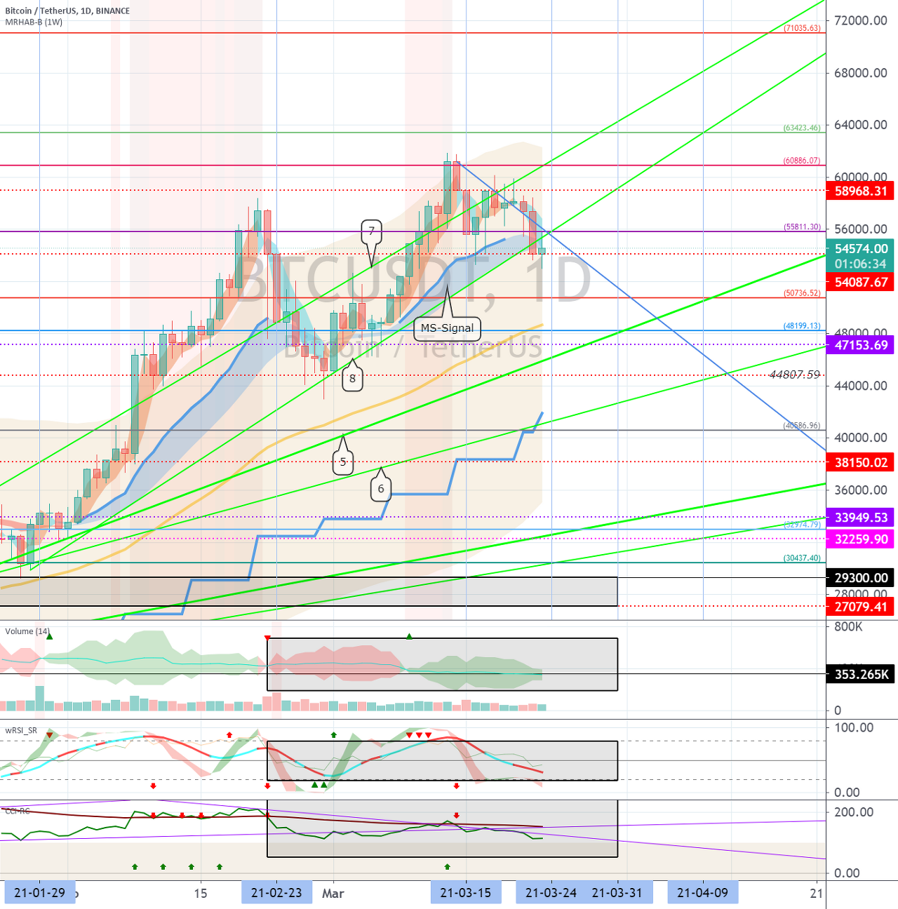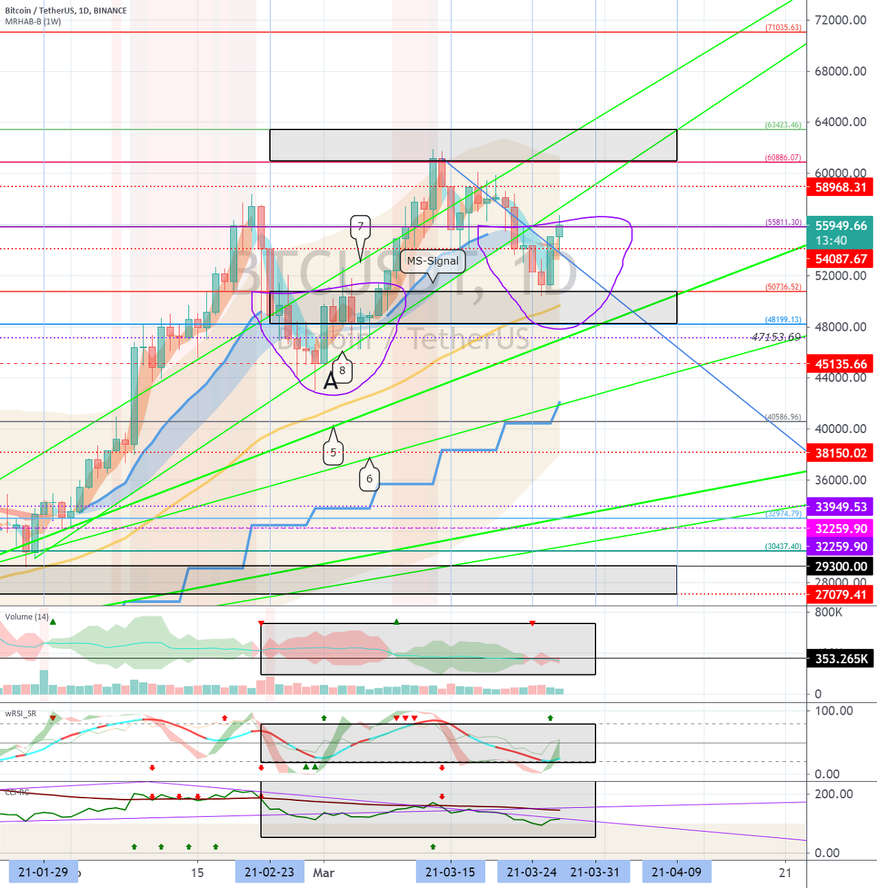 3월 31일경 (3월 30일-4월 1일)의 변동성으로 상승 추세선 (8)을 따라 상승하여 58968.31 지점 이상 상승할 수 있는지 지켜봐야 합니다.