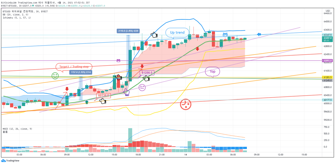 BTC 가격이 XBTUSD 차트(60904.0 지점), BTCUSDT 차트(60886.07 지점) 이상에서 지지를 받기 위해서는 거래량이 증가되어야 한다고 생가합니다.