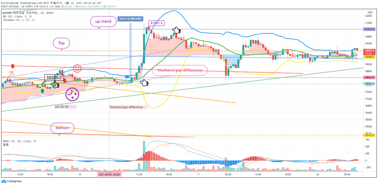 이 횡보의 구간은 XBTUSD 차트(57577.5-60904.0 구간), BTCUSDT 차트(57412.35-60886.07 구간) 이 될 가능성이 높다고 생각합니다.