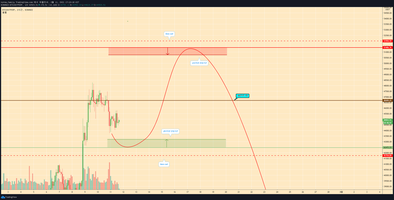 (LONG) 1. 진입 지점 : 47294.7 지점을 상향 돌파시 목표 지점 : 1차 49438.3 지점 이상, 2차 51581.9 지점 이상 Stop Loss : 46580.1 지점